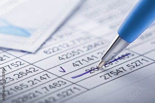 Accounting document with pen, money, coins and checking financial chart. Concept of banking, financial report and financial audit.
