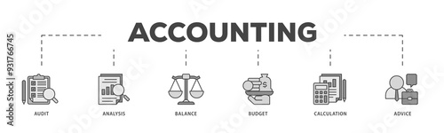 Accounting icons process structure web banner illustration of audit, analysis, balance, budget, calculation, and advice icon png transparent background.