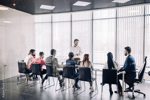 Achieving best results after annual refresher course. Indian young business mentor conducting a business training while standing in front of people sitting in row at meeting room.