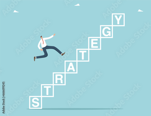 Achieving business goals, motivation and determination for great success, building and following a strategy to achieve operational excellence and career growth, man runs through the steps of strategy.