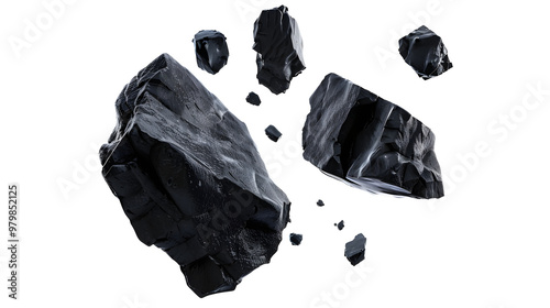 activated coal in flying dynamic position mid air, isolated on white background