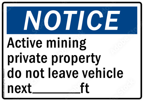 Active mining area danger sign and labels private property do not leave vehicle
