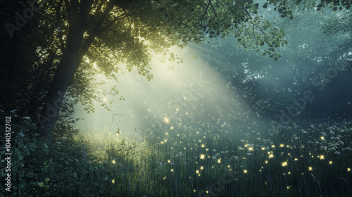Add a thin, shimmering layer of fog that catches light from glowing elements, twinkling softly as it moves through the air. The overall effect should be ethereal, creating a dreamlike atmosphere