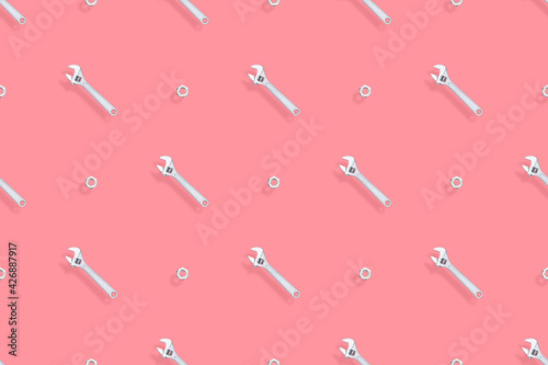 Adjustable metal wrench seamless pattern. Background from a metal wrench and nut.