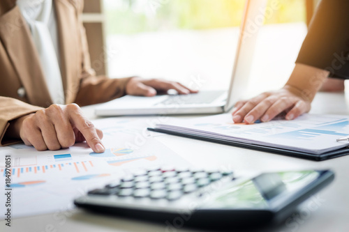 Administrator business man financial inspector and secretary making report, calculating balance. Internal Revenue Service checking document. Audit concept.