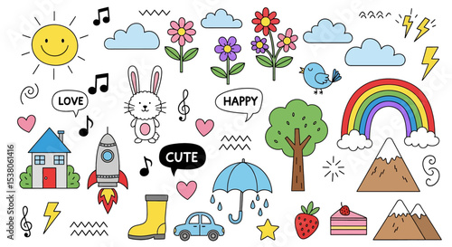 Adobe illustrator artwork vector illustration showcasing a collection of cute and colorful kids doodle elements, including nature, weather, animals, objects, and cheerful expressions