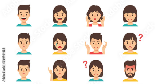 Adobe Illustrator set of avatar vector flat style illustration of diverse men and women's faces, showcasing various emotions and expressions, perfect for user interfaces and communication