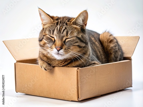 Adorable 18-year-old senior tabby cat snugly squeezed inside a small cardboard box, sleeping peacefully with selective focus on its cute features against a white background.