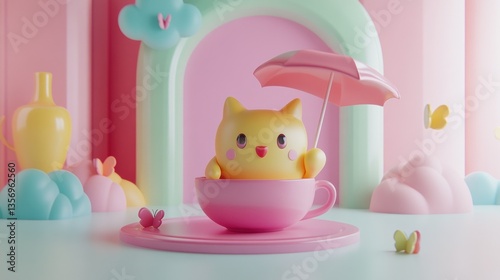 Adorable 3D Render: Kitten in Teacup with Umbrella
