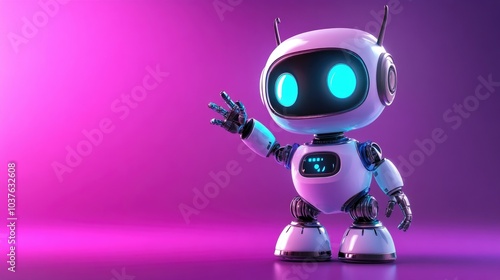 Adorable 3D robot raising a hand Charming cartoon bot 3D render Virtual assistant concept Playful robotic toy on a vibrant purple backdrop Realistic robot design