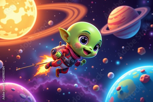 Adorable Alien Astronaut Soaring Through Vibrant Space Nebula Planets and Stars