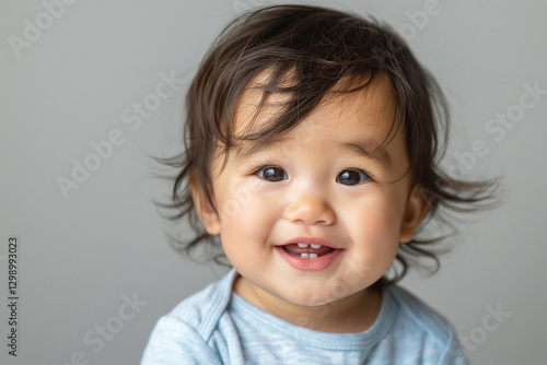 Adorable Asian baby boy with curly hair smiling brightly against a soft gray background.