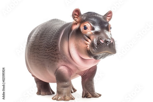 Adorable baby hippo with tiny ears and a round belly isolated on white background