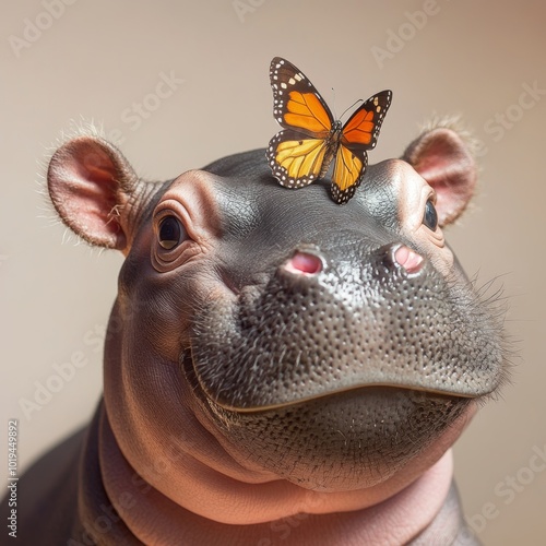 Adorable Baby Hippopotamus with Butterfly on Head Close Up Portrait