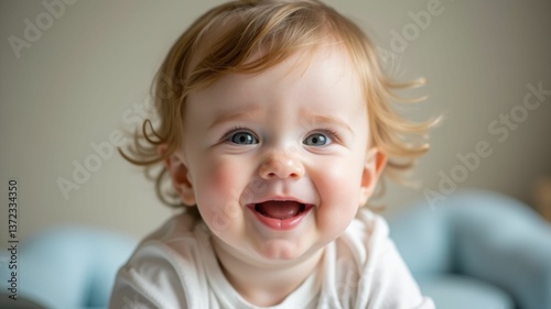 Adorable baby with bright blue eyes and curly blonde hair beaming with joy