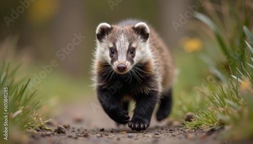 Adorable Badger Sprinting Towards Camera on Forest Path, Wildlife Portrait, Close-up.