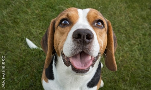 Adorable Beagle Puppy Looking Up with Innocent Eyes on Green Grass