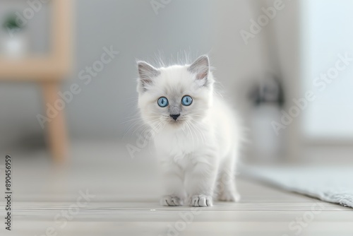 Adorable blue-eyed kitten with fluffy white fur curiously exploring a bright, minimalistic room.