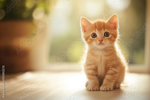 Adorable brown kitten sitting playfully with curious, wide eyes.