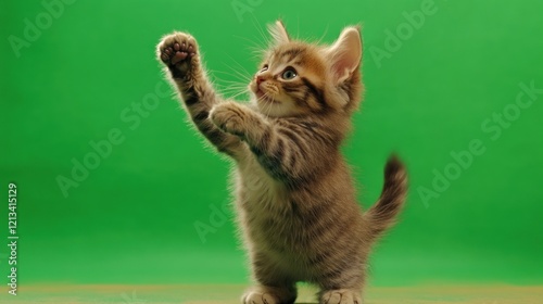 Adorable brown tabby kitten stands on hind legs with paws raised against a green backdrop