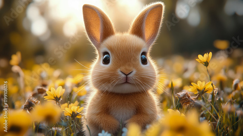 Adorable Bunny Rabbit in Yellow Flower Meadow: A Cute Springtime Image