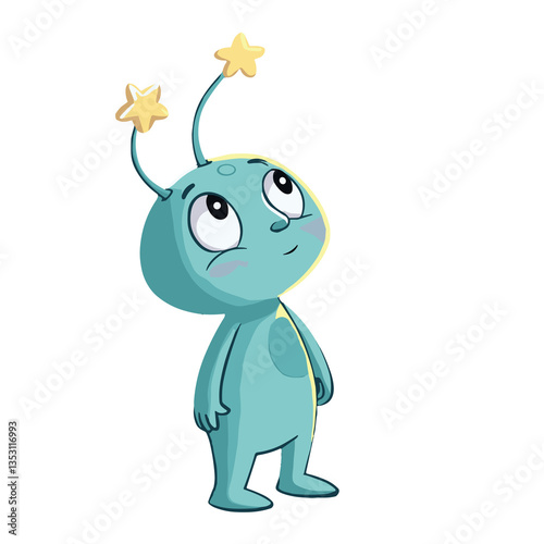 Adorable cartoon alien with star-shaped antennae and curious expression. Smooth vector-style shading and clean lines make it ideal for children’s content, space themes, and playful branding