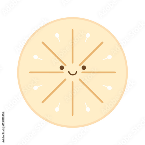 Adorable cartoon banana slice with a happy smiling kawaii face and radial lines.