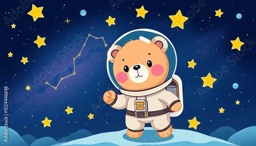 Adorable cartoon bear astronaut among star animal constellations in space , cosmos, cute