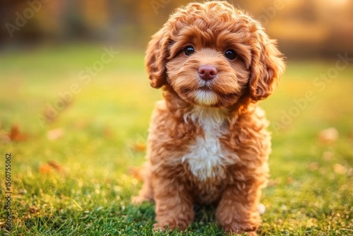 Adorable Cavoodle Puppy Portrait, Playful Canine with Charming Expression on Lush Green Grass
