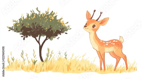 Adorable chibi deer standing on grass with a small tree, white background.