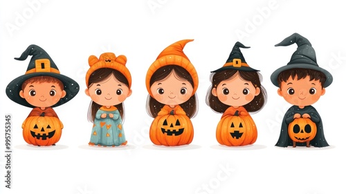 Adorable children in Halloween costumes holding pumpkin buckets, witches, ghost, and pumpkins, festive and playful, Generative AI