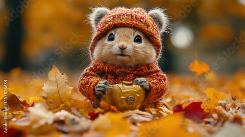 Adorable furry creature in a cozy knitted hat and sweater sits amidst autumn foliage smiling sweetly