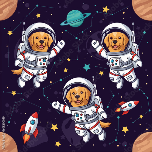 Adorable Golden Retrievers in Astronaut Suits: Fun Space Pattern for Kids' Products