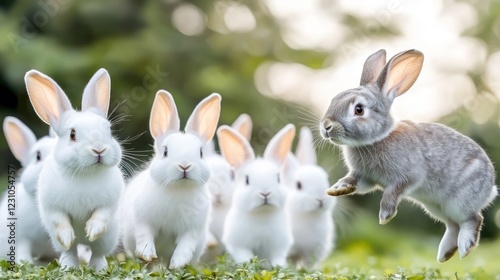Adorable Grey and White Rabbits Playing in a Lush Green Meadow