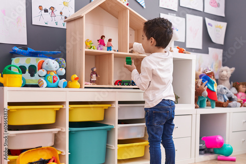 Adorable hispanic boy standing on back view playing at kindergarten
