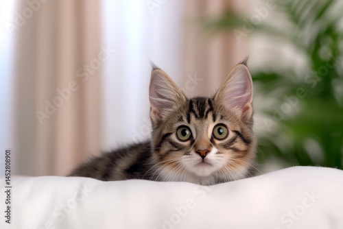 Adorable Kitten on White Blanket - A charming tabby kitten with green eyes rests on a soft white blanket, symbolizing comfort, purity, playfulness, domesticity, and tranquility