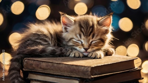 Adorable Kitten Sleeping on Stack of Old Books
