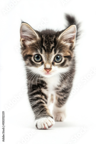 Adorable kitten with black and white fur, and bright, curious eyes walking towards the camera on a white background.