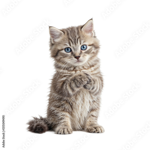 Adorable light gray kitten with blue eyes sitting upright tail wrapped around paws Innocent and fluffy on white background