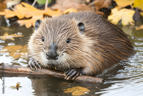 Adorable North American beaver gnawing on a branch in autumnal water. Close-up showcasing its wet fur and sharp claws.