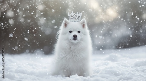 Adorable Samoyed sitting gracefully in the snow wearing a delicate crown, exuding a royal and serene charm in a winter wonderland scene.