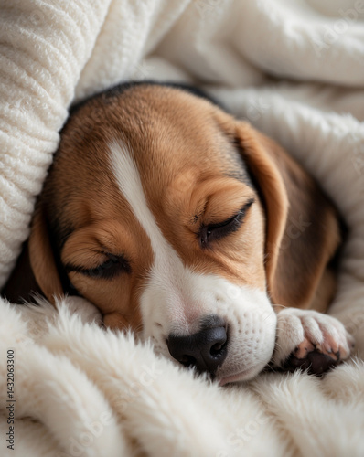 Adorable Sleeping Beagle Puppy on Soft White Blanket in Natural Light