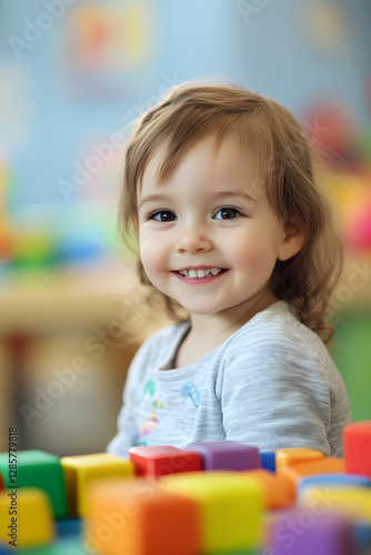 Adorable smiling toddler playing with colorful building blocks : Generative AI