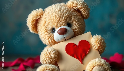Adorable teddy bear clutching a heart-shaped wax-sealed letter, sweet, background