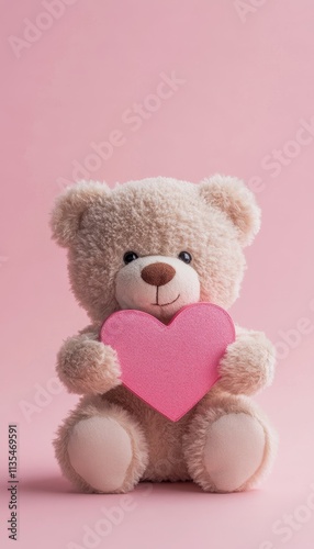 Adorable teddy bear embracing heart shaped gift box on soft pink background with generous copy space