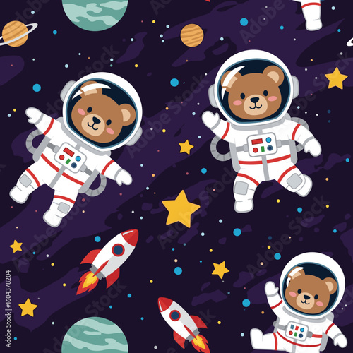 Adorable teddy bears in astronaut suits floating in space, perfect for children's book illustrations or textile designs.