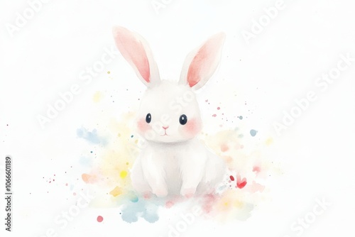 Adorable Watercolor Bunny with Soft Pastels and Gentle Splashes of Color. Watercolor Nursery Art.