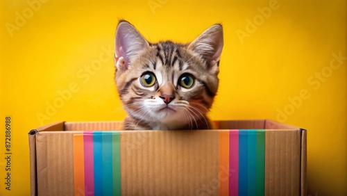 Adorable whiskered kitten peeking out of a colorful cardboard box with paws, isolated on bright yellow background, waiting for text.
