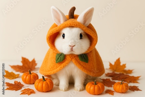 Adorable white bunny in pumpkin cloak surrounded by mini pumpkins and autumn leaves. concept of cute halloween costume, fall decor, thanksgiving celebration