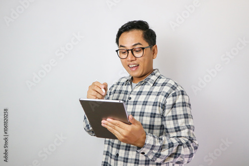 Adult Asian man smiling confident while working using his mobile tablet gadget